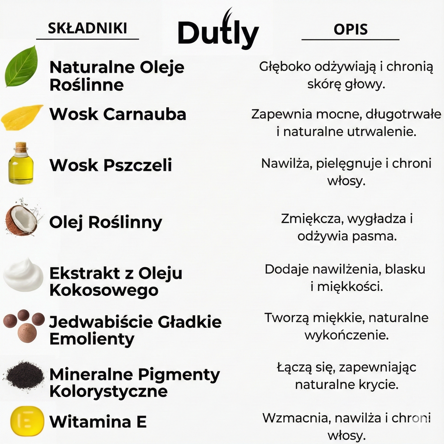 Stworzyliśmy Dutly w oparciu o w pełni naturalne i bezpieczne dla skóry składniki. Dzięki temu możesz cieszyć się efektem gęstej, zdrowej fryzury, która wygląda w 100% autentycznie – każdego dnia.